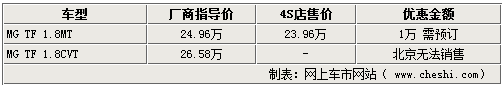與比亞迪S8同為敞篷跑車設(shè)計(jì)的MG TF跑車在北京市場仍為訂單銷售狀態(tài)。網(wǎng)上車市網(wǎng)站由北京名爵經(jīng)銷商處了解到,現(xiàn)在購買名爵MG TF跑車,雖然在價(jià)格上有萬元的優(yōu)惠,但是各店均無現(xiàn)車,需要提前預(yù)訂,具體詳情如下: