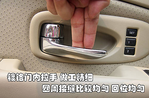 車門內(nèi)側拉手采用鍍鉻設計,金屬感比較強烈。雖然拉手周圍由塑料制成,但是拉手周圍的做工都很精細。