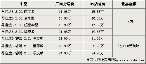 據(jù)4S店銷售人員介紹,目前馬自達6銷售的車型除了新款睿翼外,還有老款車型有現(xiàn)車供應(yīng),消費者到店購車可得到2.4萬元的現(xiàn)金優(yōu)惠,車價最低僅為15.58萬元。新款馬自達6睿翼雖然沒有現(xiàn)金方面優(yōu)惠,但購車可以贈送3000元左右的裝飾,消費者可以根據(jù)需求選購。
