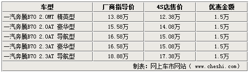 北京個(gè)各展廳內(nèi)09款奔騰B70現(xiàn)車充足,店內(nèi)現(xiàn)車近段時(shí)間優(yōu)惠幅度較大,全系車型均可以給出1.5萬元的優(yōu)惠,相比前一段時(shí)間的1.1萬元優(yōu)惠幅度有所提升,F(xiàn)階段銷售較快的型號(hào)主要是2.0L的導(dǎo)航版車型,以及2.3L高配的兩款車型。