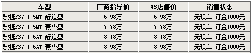 經(jīng)銷商透露,現(xiàn)在各店內(nèi)的FSV基本為展車或已被客戶預訂的車輛,基本沒有現(xiàn)車可以滿足消費者的需要,消費者如需購買可以繳納1千元訂金后等待一個月左右即可提車。由于駿捷FSV為剛剛上市的新車,所以店內(nèi)沒有任何形式的優(yōu)惠,請消費者諒解。