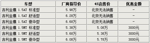 吉利金鷹自動(dòng)版車(chē)型上市已有較長(zhǎng)時(shí)間了,隨后推出了手動(dòng)擋車(chē)型。雖然車(chē)型較多,但金鷹在北京市場(chǎng)僅可銷(xiāo)售手動(dòng)版車(chē)型,自動(dòng)檔車(chē)型仍無(wú)法銷(xiāo)售。近日,網(wǎng)站由北京吉利4S店了解到,金鷹自動(dòng)檔車(chē)型進(jìn)店銷(xiāo)售仍遙遙無(wú)期,而手動(dòng)版在價(jià)格上則給出了3000元的優(yōu)惠。具體詳情如下: