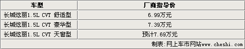 據(jù)悉,長(zhǎng)城炫麗CVT將在9月2日上市,首先會(huì)推出三款車(chē)型,其中1.5L舒適型和1.5L豪華型的售價(jià)分別為6.99萬(wàn)元和7.39萬(wàn)元。因?yàn)殪披愜?chē)型一直就沒(méi)有出天窗版,所以1.5L CVT 天窗版的價(jià)格還不明朗,預(yù)計(jì)在7.69萬(wàn)元左右。目前炫麗CVT已經(jīng)有部分現(xiàn)車(chē)抵達(dá)4S店,但因?yàn)樾萝?chē)備案原因不能上牌,目前只能夠接受預(yù)訂。