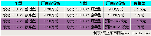 海馬歡動(dòng)1.6L共有三款車型,其中基本型由于配置低,市場上并沒有銷售,而海馬也不會(huì)為這樣一款低配車型匹配CVT變速箱,所以,歡動(dòng)1.6L CVT可能只有舒適型和豪華型兩款車。從歡動(dòng)1.8L的手動(dòng)擋和自動(dòng)擋的差價(jià)可以看到,舒適型相差1.1萬元,而豪華型也相差1萬元。依照海馬歡動(dòng)的定價(jià)規(guī)則,歡動(dòng)1.6L CVT舒適型和豪華型的價(jià)格預(yù)計(jì)為9.46萬元和10.26萬元。