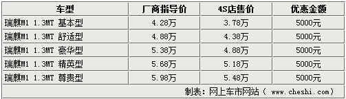據(jù)奇瑞瑞麒4S店銷售人員介紹,目前瑞麒M1只在專屬瑞麒4S店內(nèi)銷售,其它奇瑞的4S店并沒有這款車的銷售權(quán),F(xiàn)在瑞麒M1精英版及1.0車型已經(jīng)到店銷售,店內(nèi)1.3L的M1車型已經(jīng)非常齊全,并且顏色較為豐富。目前購買1.3L瑞麒M1現(xiàn)金方面可優(yōu)惠5000元。