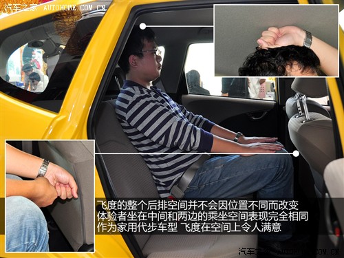但飛度的后排腿部空間達(dá)到了兩拳,這是十分出色的表現(xiàn)。不過我們也注意到,飛度之所以能有寬裕的腿部空間,和其較單薄的前排座椅設(shè)計不無關(guān)系。最后值得肯定的是,飛度的后排地板比較平坦,中間乘客的腳可以在不妨礙旁人的前提下放在舒適的位置上。