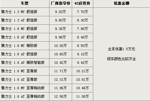 據(jù)廣汽豐田北京地區(qū)4S店銷售人員介紹,現(xiàn)在購買雅力士車型全系優(yōu)惠現(xiàn)金1.5萬元。目前雅力士1.3排量和1.6排量均有現(xiàn)車供應(yīng),現(xiàn)車顏色以黑色、紫色、銀色為主。北京地區(qū)各4S店由于訂單不同,各店銷售的現(xiàn)車顏色有所不同。