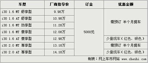 據(jù)北京現(xiàn)代北京地區(qū)4S店銷售人員介紹,現(xiàn)代i30因上市不久,新車貨源比較緊張,但現(xiàn)在已有少量1.6及2.0頂配車型現(xiàn)車到店,顏色以紅色、銀色為主。其余車型預訂最快半個月可提車,訂金為5000元。北京地區(qū)各4S店由于訂單不同,各店銷售的現(xiàn)車顏色有所不同。