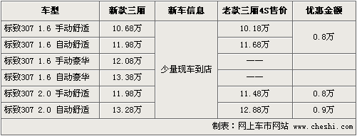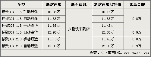 據(jù)東風(fēng)標(biāo)致北京地區(qū)4S店銷售人員介紹,目前還有少量老款307車型在售,優(yōu)惠幅度較大,手動(dòng)檔車型還贈(zèng)送加油卡,現(xiàn)在購(gòu)買比較劃算。新款307車型少量現(xiàn)車已到店,但車型及顏色還不齊全,預(yù)訂要交定金3千元,提車等1個(gè)月,而且暫無(wú)任何優(yōu)惠。如想購(gòu)買新款車型的朋友不妨等一陣時(shí)間,新款307大批量現(xiàn)車會(huì)陸續(xù)到店。