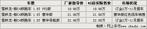 記者從北京地區(qū)進口雪鐵龍經(jīng)銷商處了解到,目前剛上市的C4轎跑車已經(jīng)有展車到店,并只有售價21.98萬元的一款車型可以現(xiàn)車銷售,而且只有紅色一款車型,提車不需要加錢。其余兩款車型均需要提前預(yù)定,訂金為2萬元,車主最早可以在11月份提到現(xiàn)車。