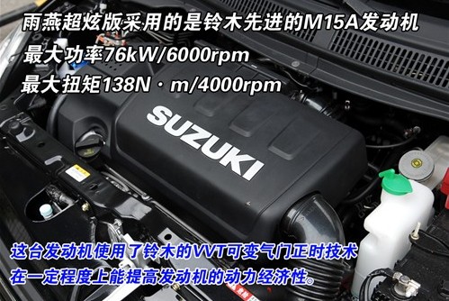 售價(jià)達(dá)到9.88萬(wàn)元的1.5炫酷版AT在強(qiáng)調(diào)性價(jià)比的雨燕全系中是頂配車型,因此勢(shì)必要配備一些豪華型配置。諸如全車六安全氣囊、多功能方向盤以及自動(dòng)空調(diào)都是小型車中少有的。而此車型搭載的1.5L發(fā)動(dòng)機(jī)更是值得推薦。這臺(tái)M15A發(fā)動(dòng)機(jī)是雨燕上市一段時(shí)間后才追加的動(dòng)力單元,目的就是提高雨燕的動(dòng)力表現(xiàn)。1.5L發(fā)動(dòng)機(jī)采用了全鋁材質(zhì)重量更輕,同時(shí)配有VVT可變氣門正時(shí)系統(tǒng),在燃油經(jīng)濟(jì)性方面也得到了提升。