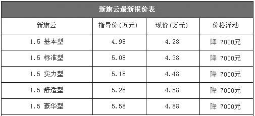 新旗云是目前國(guó)內(nèi)市場(chǎng)上最便宜的緊湊型新車(chē),全系售價(jià)均在4-5萬(wàn)元區(qū)間,性價(jià)比比夏利等競(jìng)爭(zhēng)對(duì)手高出不少,非常值得入手。近日,編輯從北京地區(qū)的亞運(yùn)村汽車(chē)交易市場(chǎng)奇瑞汽車(chē)綜合經(jīng)銷(xiāo)商處了解到,近期新旗云全系可優(yōu)惠7000元,和8月底9月初的價(jià)格持平,其中新旗云最低配車(chē)型的售價(jià)為4.28萬(wàn)元,僅比夏利貴了5000元左右,性價(jià)比突出。以下是新旗云最新報(bào)價(jià)表: