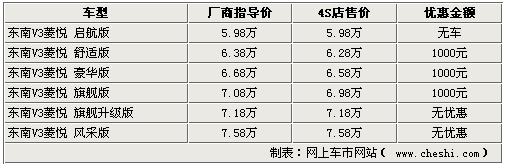 據(jù)東南經(jīng)銷商處銷售人員介紹,目前V3菱悅風(fēng)采版及升級(jí)后的旗艦版正在逐步充足貨源,最低配的車型仍因尚未投產(chǎn)而無(wú)法購(gòu)買,請(qǐng)消費(fèi)者諒解。V3風(fēng)采版系列車型各店已少量到店,而升級(jí)后的旗艦版V3也正在全國(guó)配送當(dāng)中。銷售人員還說(shuō),現(xiàn)在購(gòu)車不論風(fēng)采版還是升級(jí)的旗艦車型均沒(méi)有任何形式的現(xiàn)金優(yōu)惠,僅有精美的裝飾贈(zèng)送。而老款的V3菱悅旗艦版則可以優(yōu)惠1000元。