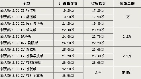 據(jù)東風(fēng)日產(chǎn)經(jīng)銷店銷售人員介紹,目前新天籟(報價 參數(shù) 圖片 論壇)2.0舒適版和2.5領(lǐng)先版等比較受歡迎的車型有現(xiàn)車供應(yīng),主要為銀色/灰色等外觀。其他尊雅版車型需要預(yù)訂。目前的優(yōu)惠幅度為2萬元-2.3萬元不等,入門車型優(yōu)惠后僅售17.28萬元,對消費者而言性價比比較強。