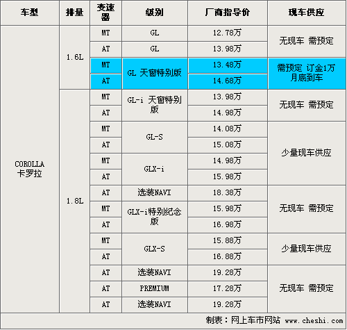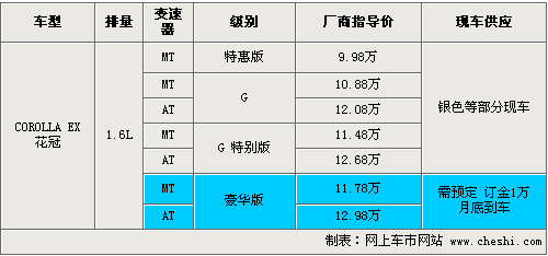花冠EX系列兩款豪華版車(chē)型在增加了天窗的基礎(chǔ)上,還配置了真皮座椅、前閱讀燈等實(shí)用配置。價(jià)格放買(mǎi)你相比較G特別版漲了3000元。新增加的4款車(chē)型均為1.6小排量車(chē)型,消費(fèi)者在購(gòu)車(chē)同時(shí)可以享受購(gòu)置稅優(yōu)惠活動(dòng),目前尚沒(méi)有現(xiàn)車(chē)到店,消費(fèi)者購(gòu)車(chē)的話(huà)需要交訂金1萬(wàn)元,預(yù)計(jì)月底可以到車(chē)。