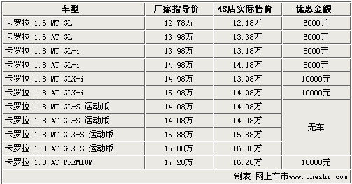 據(jù)一汽豐田4S店銷(xiāo)售人員介紹:目前2.0L排量的運(yùn)動(dòng)版車(chē)型無(wú)現(xiàn)車(chē)銷(xiāo)售,購(gòu)買(mǎi)其他車(chē)型則可以享受到8000元——10000元的現(xiàn)金優(yōu)惠。入門(mén)級(jí)的1.6 MT GL版車(chē)型售價(jià)降到了12.18萬(wàn)元,高配的1.8 AT PREMIUM版經(jīng)10000元優(yōu)惠后,售價(jià)也降到了16.28萬(wàn)元。