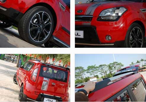 東風(fēng)悅達起亞SOUL由官方提供了一套改裝配件,正如您在上面照片中所看到的,包括前后保險杠、大燈下方的燈眉、18寸黑色花型輪轂、車身側(cè)面裙邊包圍、后尾翼以及車身拉花,一臺普通的SOUL就這樣變身為了一臺與眾不同的SOUL,多了幾分動感也多了幾分張揚。