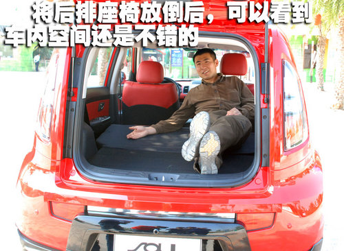 后排座椅可以全部放倒或是4/6比例分割放倒,這里面的空間足夠容納兩個人或是一臺大洗衣機(jī)或是電視了,買來SOUL用來搬家也許不是最好的主意,不過一旦有需求SOUL真的可以滿足儲物的需要了。后排座椅在乘坐三名乘員的時候顯得比較緊湊,畢竟這還只是一臺A0級的小車而已,所以對于空間我們也不應(yīng)有太多的奢求。