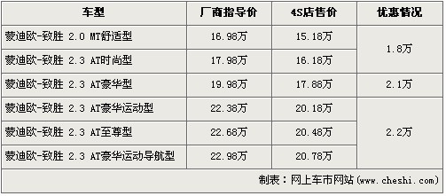 據(jù)4S店銷售人員介紹:在售的蒙迪歐-致勝共有6款車型,近期購買的消費者最高可以得到2.2萬元的優(yōu)惠。入門級的2.0L手動舒適版以及2.3L自動時尚版經(jīng)1.8萬元的優(yōu)惠后,售價分別降為了15.18萬元和16.18萬元,2.3L自動豪華版經(jīng)2.1萬元優(yōu)惠后,售價降到了2.1萬元。2.3L豪華運動版、至尊版以及豪華運動導航版經(jīng)全系最高的2.2萬元優(yōu)惠后,售價分別降為了20.18萬、20.48萬以及20.78萬元。