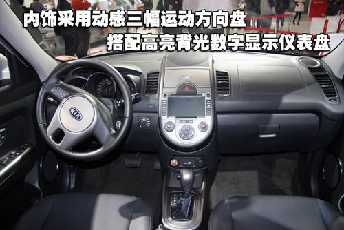 SOUL的內(nèi)飾上突出了強(qiáng)烈的未來感和科技感,三幅運(yùn)動(dòng)方向盤配合高亮背光數(shù)字顯示儀表盤,中控臺溫馨的色調(diào)設(shè)計(jì)加上夜晚會發(fā)出熒光的座椅。AUX & USB接口可以接入各種多媒體載體,前門兩側(cè)的音響發(fā)光系統(tǒng)隨著音樂有節(jié)奏地律動(dòng),配上環(huán)繞全車的8聲道喇叭帶來的完美音效表現(xiàn)和集成了常用控制按鈕的方向盤,在車內(nèi)就能輕松玩轉(zhuǎn)音樂時(shí)尚。