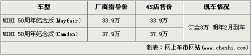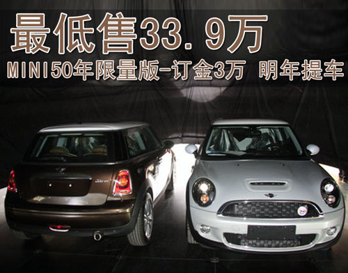 據(jù)北京經(jīng)銷店銷售人員介紹,MINI50周年分為Mayfair和Camden兩款車型,售價(jià)分別我餓哦33.9萬(wàn)元和37.9萬(wàn)元。目前店內(nèi)已經(jīng)可以接受MINI50周年紀(jì)念版車型的預(yù)訂,訂金為3萬(wàn)元,最早一批現(xiàn)車將會(huì)在明年的2月份交到消費(fèi)者的手里。