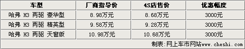 據(jù)長城汽車4S店銷售人員介紹,長城哈弗H3的現(xiàn)車都比較齊全,并且出現(xiàn)了一定的優(yōu)惠幅度。但相比前幾個(gè)月,優(yōu)惠幅度卻有所減少,目前購買哈弗H3都可以優(yōu)惠3000元。另外銷售人員表示,長城哈弗H3的廠商指導(dǎo)價(jià)只是白色普通漆車型,金屬漆其他顏色車型需要加價(jià)2000元。