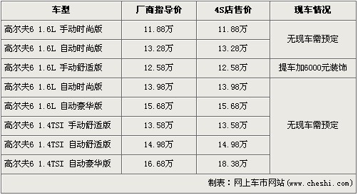 據(jù)北京一汽大眾4S店銷(xiāo)售人員介紹,目前高爾夫6全系只有1.6L手動(dòng)舒適版有現(xiàn)車(chē),欲提這款車(chē)型的消費(fèi)者需在購(gòu)車(chē)時(shí)加裝店內(nèi)價(jià)值6000元的裝飾后方可提車(chē)。店內(nèi)其他車(chē)型均無(wú)現(xiàn)車(chē),欲購(gòu)買(mǎi)者需交訂金2000元,約等3個(gè)月后才可提車(chē)。