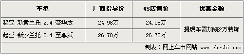 據(jù)進(jìn)口起亞4S店銷售人員介紹,新索蘭托近日到達(dá)一批新車,但銷售較快,所以現(xiàn)車情況還是非常緊俏,預(yù)訂訂單已經(jīng)排到明年5月份,需交訂金1萬元。如果消費者急于提現(xiàn)車的話,需要在店內(nèi)加裝2萬元裝飾,裝飾包括:腳墊、貼膜、地膠、封釉、加不銹鋼保險杠等,F(xiàn)車顏色以黑色、銀色、灰色為主。