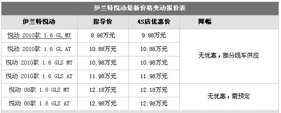 2010款悅動目前僅推出1.6一種排量4款車型在售。GL版配備了ABS/EBD和前排雙安全氣囊等安全裝置,同時標配電動車窗、后視鏡電動調(diào)節(jié)和單碟CD等配置。GLS版則在舒適版的基礎(chǔ)上增加了電動天窗和多功能方向盤等配置,并對輪胎進行了升級。