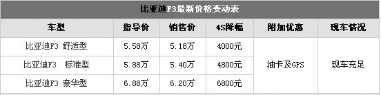 筆者從滬上經(jīng)銷商處了解到,比亞迪F3豪華版最高優(yōu)惠6800元,而舒適型和標準型各優(yōu)惠4000元和4800元。目前現(xiàn)車充足,到店即可提車,感興趣的朋友不妨到店詳談,可以爭取到更多的讓利。