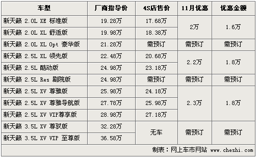 筆者了解,相比11月份的優(yōu)惠幅度,目前新天籟價格最高優(yōu)惠僅為1.8萬元,上個月的最高優(yōu)惠則為2.3萬元,但是現(xiàn)車供應(yīng)情況仍然比較緊張,除了標(biāo)準(zhǔn)版和舒適版有部分可選擇外,2.5升的部分車型仍需要訂購,月底將到一批新車。入門級優(yōu)惠后售價為17.68萬。