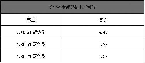 9月16日,長安鈴木新奧拓正式上市。此次上市的新奧拓將推出1.0L排量三款車型,分別為1.0L手動(dòng)舒適型、1.0L手動(dòng)豪華型和1.0L自動(dòng)豪華型,售價(jià)在4.49-5.89萬元之間。具體售價(jià)如下表:長安鈴木新奧拓上市售價(jià)