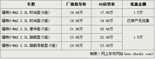 據(jù)北京福特4S店銷售人員介紹,店內(nèi)在售的福特S-MAX有1.5萬元的現(xiàn)金優(yōu)惠,并且7座的時尚版車型已經(jīng)停產(chǎn)。經(jīng)1.5萬元優(yōu)惠后,2.3L豪華版、旗艦版、旗艦導(dǎo)航版的售價分別降為了20.48萬元、22.48萬元和23.08萬元,入門級的5座時尚型售價降到了17.98萬元。