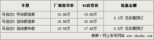 據(jù)一汽馬自達(dá)北京地區(qū)4S店銷(xiāo)售人員介紹:馬自達(dá)5的現(xiàn)車(chē)供應(yīng)持續(xù)比較緊張,現(xiàn)購(gòu)買(mǎi)頂配車(chē)型最高優(yōu)惠現(xiàn)金9千元,低配車(chē)型優(yōu)惠3千元。店內(nèi)目前沒(méi)有現(xiàn)車(chē)供應(yīng),需要預(yù)訂,訂金為1萬(wàn)元,最快等待15天左右可以提車(chē)。如消費(fèi)者有意購(gòu)買(mǎi),到店詳談會(huì)有更優(yōu)惠的價(jià)格。北京地區(qū)各4S店由于訂單不同,各店銷(xiāo)售的現(xiàn)車(chē)顏色有所不同。