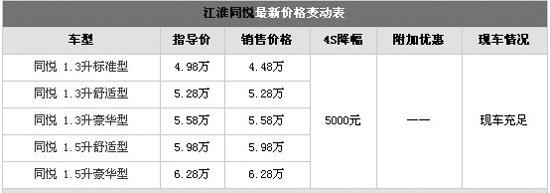 江淮同悅有1.3L和1.5L兩種排量,全為手動(dòng)檔車型。分標(biāo)準(zhǔn)型、舒適型和豪華型三種配置。標(biāo)準(zhǔn)型無安全氣囊,配備有ABS制動(dòng)防抱死系統(tǒng),四門車窗和電調(diào)后視鏡;舒適型增添了駕駛座安全氣囊、倒車?yán)走_(dá)、遙控鑰匙和中控;豪華型相對于舒適型升級了副駕安全氣囊和前霧燈安全配置,配備了單碟CD機(jī)并升級了音響系統(tǒng),增加了后視鏡加熱功能和鋁合金輪轂。