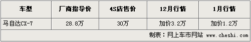 據(jù)一汽馬自達(dá)4S店銷售人員介紹:CX-7自上市起一直加價3.2萬元,近期該車型加價所有降低,提現(xiàn)車需加價1.2萬元,日前店內(nèi)有黑色及銀色現(xiàn)車供應(yīng),購車可贈送貼膜、倒車?yán)走_(dá)等裝飾。如消費(fèi)者有意購買,到店詳談會有更優(yōu)惠的價格。北京地區(qū)各4S店由于訂單不同,各店銷售的現(xiàn)車顏色有所不同。