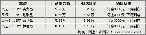 奇瑞經(jīng)銷商表示,現(xiàn)在店內的風云2新車不全,消費者購車需要繳納3000元訂金并等待半個月才可提車。由于是全新的車型,所以現(xiàn)階段購車暫時沒有任何形式上的優(yōu)惠。