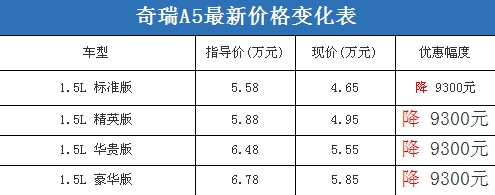 近日,編輯從北京地區(qū)綜合經(jīng)銷商處了解到,奇瑞A5的現(xiàn)車充足,有黑色和灰色現(xiàn)車;目前購車的優(yōu)惠幅度接近1萬元,最低配的標(biāo)準(zhǔn)版奇瑞A5已經(jīng)僅售4.65萬元。據(jù)經(jīng)銷商透露,消費者要想以這個價格提車,需要在店內(nèi)做一條龍,其中車輛四項基本保險可以打9折。以下是奇瑞A5最新價格變化表:
