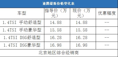 近日,編輯從北京地區(qū)一汽-大眾4S經銷商處了解到,速騰1.4TSI有少量現車,但是在4S經銷商處購車均需要加裝5000-1.2萬元的汽車裝飾(價值3000元左右的基本裝飾),經銷商表示這種加裝方式不能折合成現金。相比之下,速騰1.4TSI車型在綜合經銷商處的性價比要高一些,雖然沒有任何現金優(yōu)惠,但是不用加價提車,也不需要加裝汽車裝飾。據綜合經銷商透露,消費者要想以這個價格提車,要在店內做一條龍服務才可以,其中車輛四項基本保險可以打9折。以下是速騰1.4T最新價格變化表: