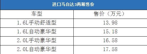 1月18日,進(jìn)口馬自達(dá)3兩廂在珠海正式上市,上市車型包括1.6L和2.0L兩個(gè)排量、共4款車型,具體包括1.6L手動舒適型、1.6L自動豪華型、2.0L手動豪華型和2.0L自動豪華型,售價(jià)13.98-17.58萬元,具體售價(jià)如下表: