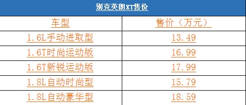 1月23日,上海通用全新五門轎跑英朗正式上市,據(jù)悉此次上市共推五款車型,分別為1.6L手動進(jìn)取版、1.8L自動時尚版、1.8L自動豪華版、1.6T時尚運(yùn)動版及1.6T新銳運(yùn)動版,售價13.49-18.59萬元,具體售價如下表所示: