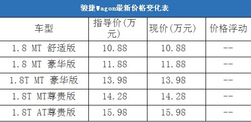 近日,編輯從華晨中華4S經(jīng)銷商處了解到,駿捷Wagon有少量現(xiàn)車,部分車型需要預(yù)定,最多等待1個(gè)月就可以提車,定金為5000元。據(jù)經(jīng)銷商透露,目前這款車沒有任何現(xiàn)金優(yōu)惠,需要消費(fèi)者到店內(nèi)與銷售人員詳談才能爭取少量優(yōu)惠。以下是駿捷Wagon最新價(jià)格變化表: