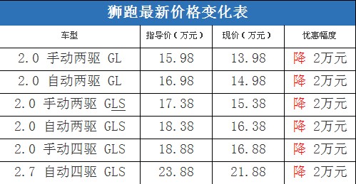 近日,編輯從北京地區(qū)綜合經(jīng)銷商處了解到,獅跑全系的現(xiàn)車充足,基本上可以滿足消費者在春節(jié)期間的需求;目前購車全系可以優(yōu)惠2萬元現(xiàn)金,性價比很不錯。據(jù)經(jīng)銷商透露,消費者要想以這個價格提車,需要在店內(nèi)做購車一條龍服務,其中車輛四項基本保險可以打8.5折(約合4500-6300元左右)。以下是獅跑最新價格變化表: