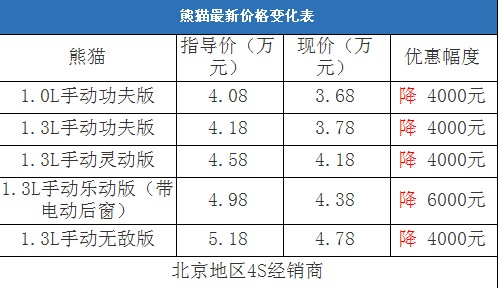 近日,編輯從北京地區(qū)吉利4S經(jīng)銷商處了解到,熊貓有少量現(xiàn)車在店內(nèi)銷售,全系可以優(yōu)惠4000元現(xiàn)金,并贈(zèng)送腳墊、貼膜等基本裝飾。其中店內(nèi)有一臺(tái)1.3L手動(dòng)樂動(dòng)版特價(jià)車(紅色),因?yàn)槭?9年生產(chǎn)的,可以優(yōu)惠6000元現(xiàn)金,性價(jià)比還不錯(cuò),消費(fèi)者可以到店詳談爭取更多優(yōu)惠。以下是熊貓最新價(jià)格變化表: