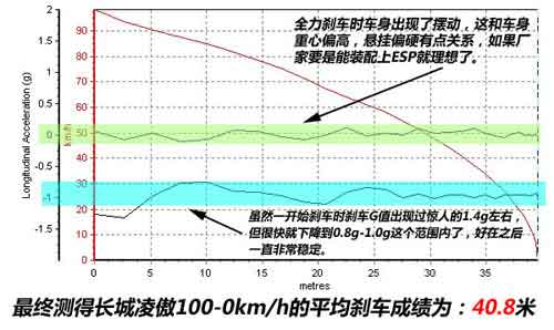 從剎車圖表上看,凌傲的初段剎車力度非常足,開始時最大的G值竟然超過了1.3G左右,但比較遺憾的是沒能保持下去,在整個剎車過程中出現(xiàn)了比較大的波動,不過好在之后的剎車G值也能保持在1G左右,另外較硬的懸掛以及緊湊的車身也對剎車成績有一定的幫助。