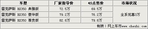 據(jù)北京雷克薩斯4S店銷售人員透露,目前初低配版本的RX350典雅版車型的貨源相對(duì)比較緊張,其余兩款車型的貨源充足,只是個(gè)別顏色需要預(yù)定,訂貨周期在10個(gè)工作日左右,F(xiàn)在購(gòu)車在可以得到3萬(wàn)元的現(xiàn)金優(yōu)惠還,還可以得到商家贈(zèng)送的簡(jiǎn)單裝飾。