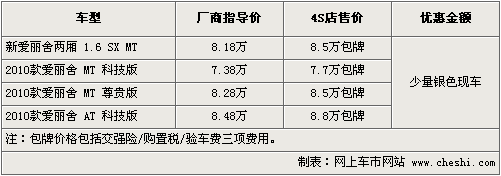 據(jù)東風雪鐵龍4S店銷售人員介紹,目前愛麗舍全系車型均為包牌銷售,其中兩廂包牌價8.5萬元,三廂三款車型包牌價分別為7.7萬元,8.5萬元以及8.8萬元。包牌價分別包括了交強險,購置稅和驗車費。對消費者而言節(jié)省了不少的費用,F(xiàn)車方面只有極少量手動科技版現(xiàn)車,顏色以銀色為主。其它車型及顏色需要預定,訂金1千元,2周左右可以提到車。北京地區(qū)各4S店由于訂單不同,各店銷售的現(xiàn)車顏色有所不同。