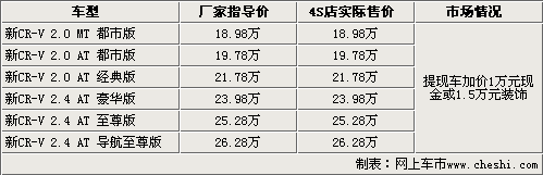 東風(fēng)本田旗下的CR-V車型自上市以來,一直以其較高的性價(jià)比占領(lǐng)著國(guó)內(nèi)家用SUV市場(chǎng)的半壁江山,提現(xiàn)車的加價(jià)銷售從CR-V上市之日起持續(xù)到了現(xiàn)在,CR-V的暢銷為同級(jí)別車型樹立了典范。3月5日東風(fēng)本田正式推出全新的CR-V,在售價(jià)不變的情況下對(duì)全系車型進(jìn)行了配置升級(jí),并推出了導(dǎo)航版車型。那么新車上市后的市場(chǎng)行情是什么樣子呢?根據(jù)網(wǎng)上車市價(jià)格監(jiān)測(cè)系統(tǒng)顯示,全新上市的CR-V依然存在加價(jià)售車的現(xiàn)象。具體車型售價(jià)見下表:
