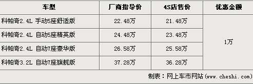 據(jù)經(jīng)銷商銷售人員介紹,消費者于近期購買雪佛蘭-科帕奇任意一款車型,可以得到1萬元的現(xiàn)金優(yōu)惠,2.4L排量高配的七座手自一體豪華版經(jīng)優(yōu)惠后售價為25.58萬元,而低一級的2.4L手動五座舒適版經(jīng)優(yōu)惠后售價降為21.48萬元。頂級的3.2L自動7座旗艦版經(jīng)優(yōu)惠后,售價從37.28萬元下降到了36.28萬元。