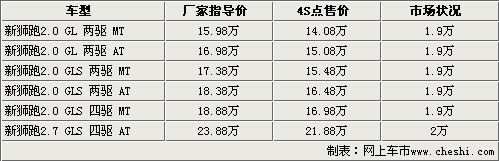 東風(fēng)悅達(dá)起亞獅跑和北京現(xiàn)代途勝屬于同平臺(tái)車(chē)型,但相比途勝,獅跑外觀更有活力,F(xiàn)售的09款獅跑,時(shí)尚的外觀和改款后配置的重新升級(jí),使獅跑在同級(jí)別中的性?xún)r(jià)比進(jìn)一步提升。近日根據(jù)網(wǎng)上車(chē)市價(jià)格監(jiān)測(cè)系統(tǒng)顯示,目前獅跑最高優(yōu)惠達(dá)到2萬(wàn)元,其中2.0和2.7的四驅(qū)車(chē)型需要提前預(yù)定。具體車(chē)型售價(jià)見(jiàn)下表: